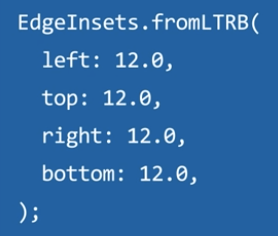 EdgeInsets.fromLTRB๋ฅผ ์ฌ์ฉํ๋ฉด ์ํ๋ child์ ์ผ์ชฝ, ์, ์ค๋ฅธ์ชฝ, ์๋ ๊ฐ๊ฐ์ ์ฌ๋ฐฑ ํฌ๊ธฐ๋ฅผ ๊ฒฐ์ ํ ์ ์๋ค.