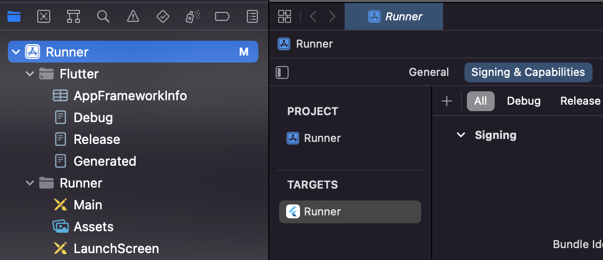 3. Runner > Targets์ Runner๋ฅผ ์ ํํ๊ณ , Signing & Capabilities์ Signing