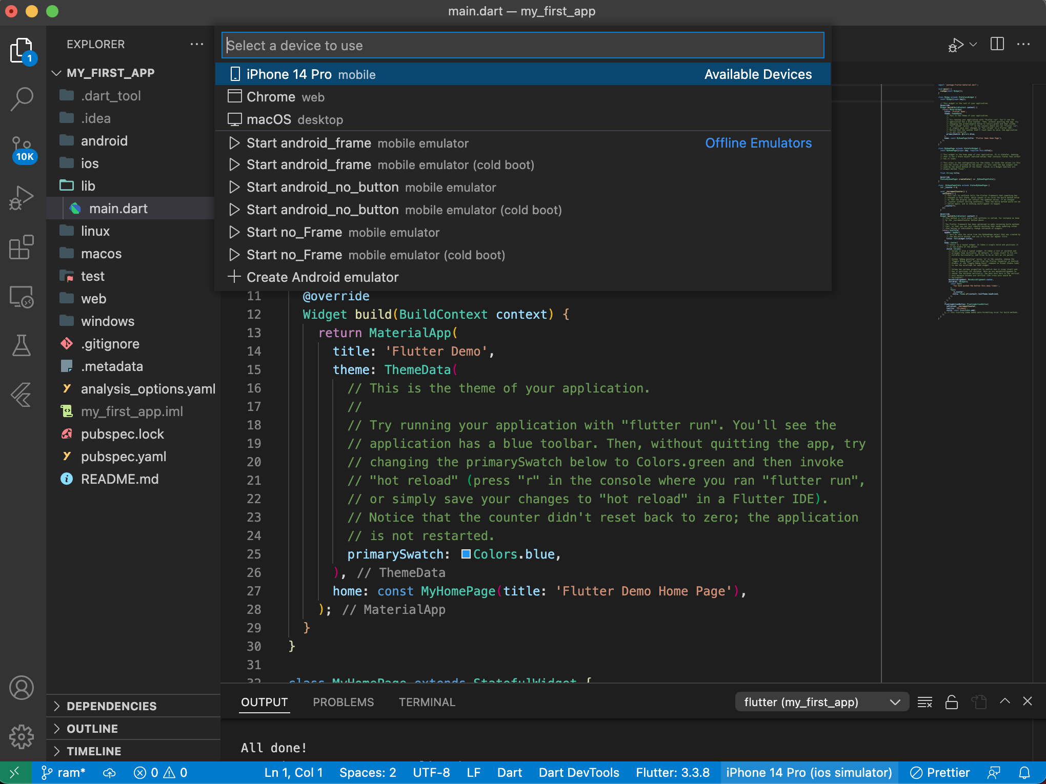 ๋จผ์ lib/main.dart ๋ฅผ ์ด์ด target device๊ฐ ์ ํ๋์๋์ง ํ์ธํด๋ณธ๋ค.