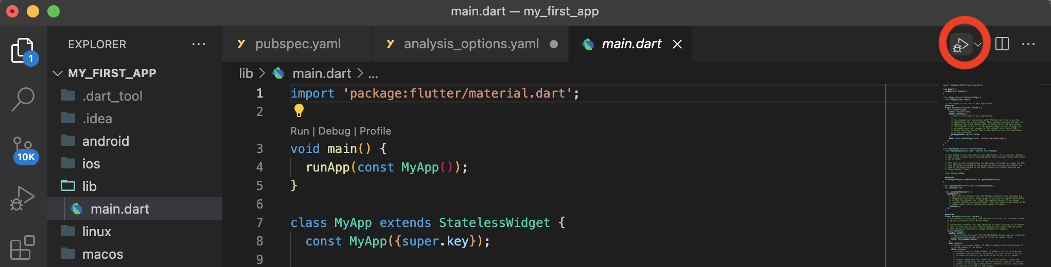 ์ฐ๋ฆฌ๋ main() ์ด๋ผ๋ ์ด๋ฆ์ ํจ์๋ฅผ ์ฐพ์ ์ ์๋๋ฐ, ์ด ํจ์ ๋ด์ ์๋ ์ฝ๋๋ MyApp์ ์ ์๋ ์ฑ์ ์คํํ๋๋ก Flutter์ ์๋ ค์ฃผ๋ ๊ฒ์ด๋ค.