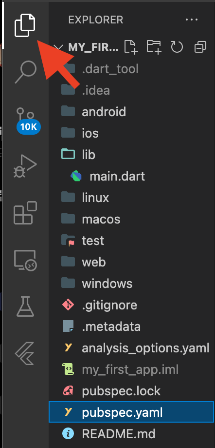 codelab์ ๋ฐ๋ผํ๊ธฐ ์ํด ์ฃ์ธก ์๋จ์ ์๋ ์์ด์ฝ์ ๋๋ฅด๊ณ , pubspec.yaml ํ์ผ์ ์ ํํ๋ค.