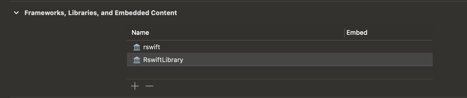 2. ๋ค์์ผ๋ก ํ๊น-> general์ ์ ํํ ๋ค, Frameworks, Libraries, and Embeded Content ์น์ ์์ + ๋ฒํผ์ ๋๋ฌ RswiftLibrary๋ฅผ ์ถ๊ฐํด์ฃผ๋ผ๊ณ ํ๋ค.