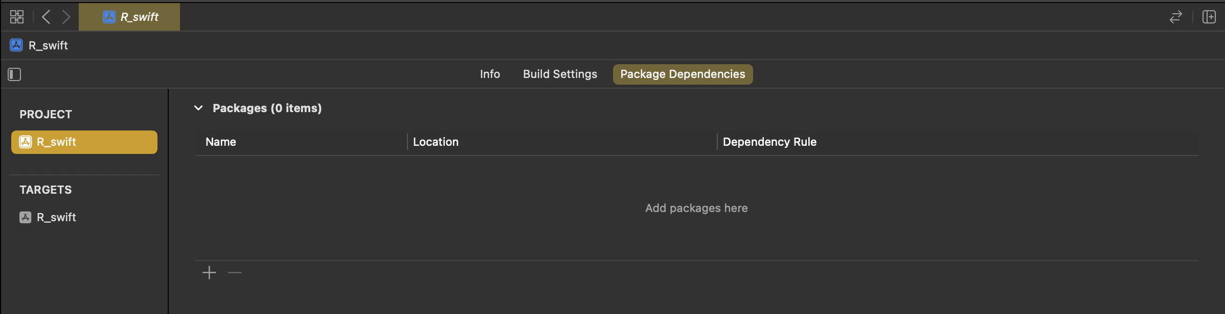 1. ๋จผ์ xcode์์ Package Dependencies ํญ์ ๋ค์ด๊ฐ +๋ฅผ ํด๋ฆญํ๋ค.