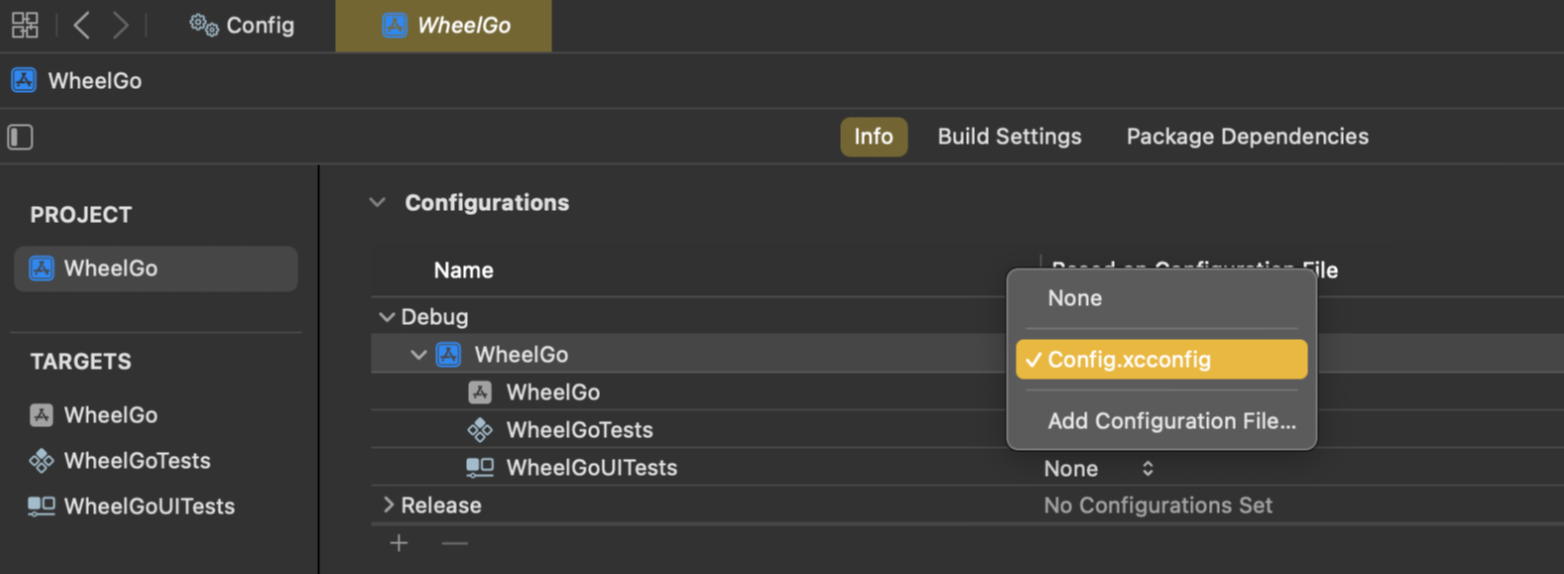 Xcode → Project → Info → Configurations์์ Config.xcconfig๋ฅผ ์ค์