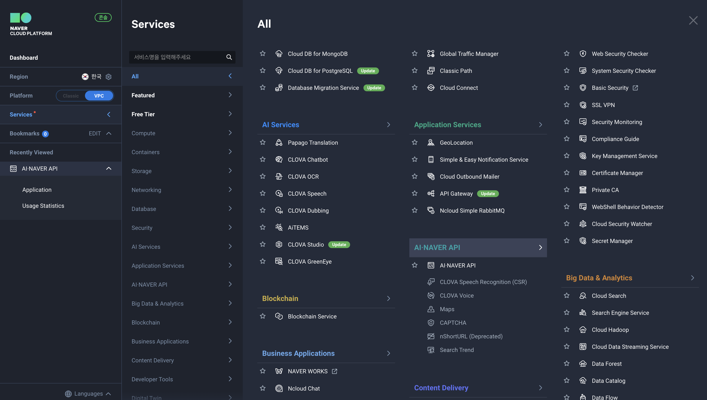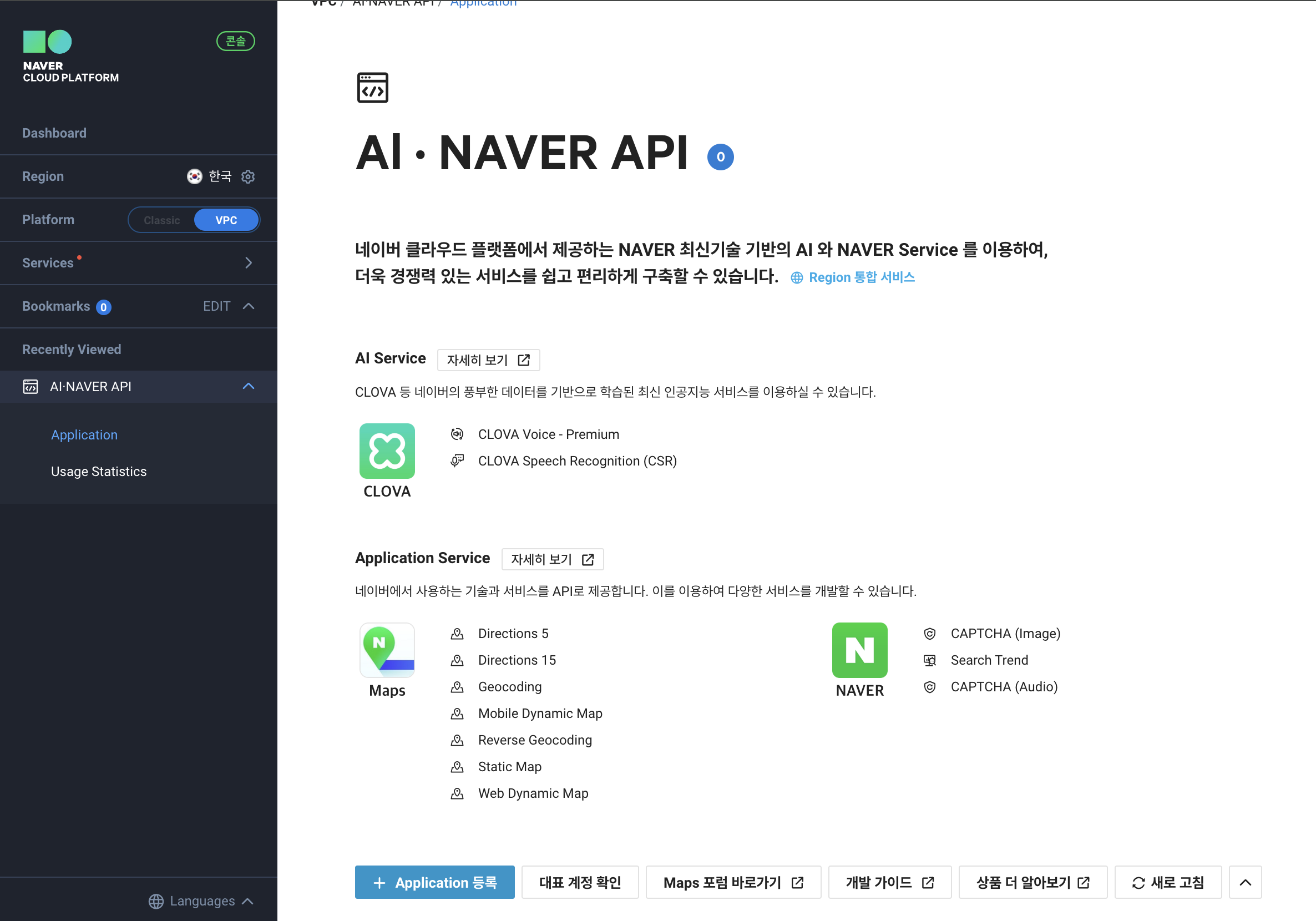 1-1. Products & Services์์ AI-Application Service ํ์์ AI·NAVER API๋ฅผ ์ ํํ๋ค.
