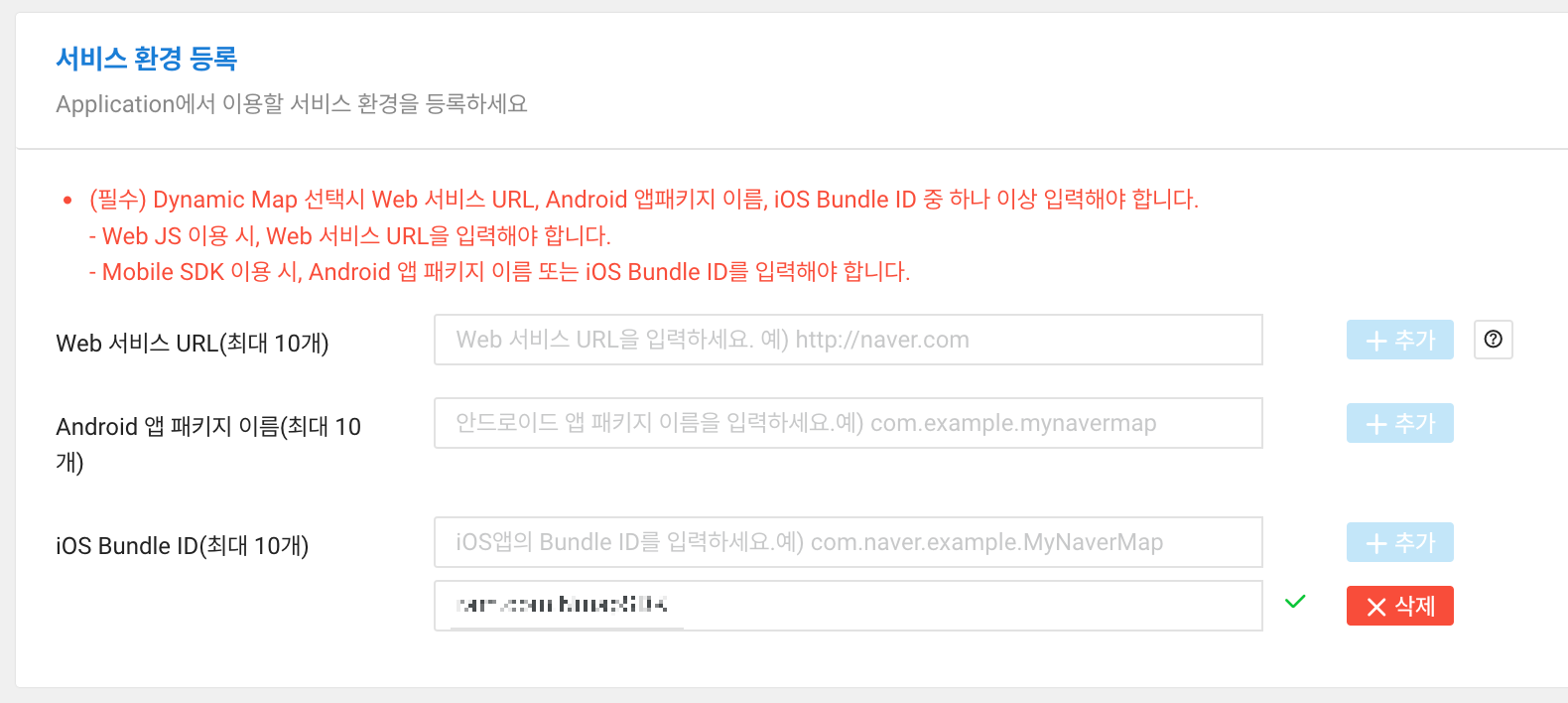 1-3. iOS Bundle ID์ ๋ค์ด๋ฒ ์ง๋ SDK๋ฅผ ์ฌ์ฉํ๊ณ ์ ํ๋ ์ฑ์ ์ด๋ฆ๊ณผ ๋ฒ๋ค ID๋ฅผ ์ถ๊ฐํ๋ค.