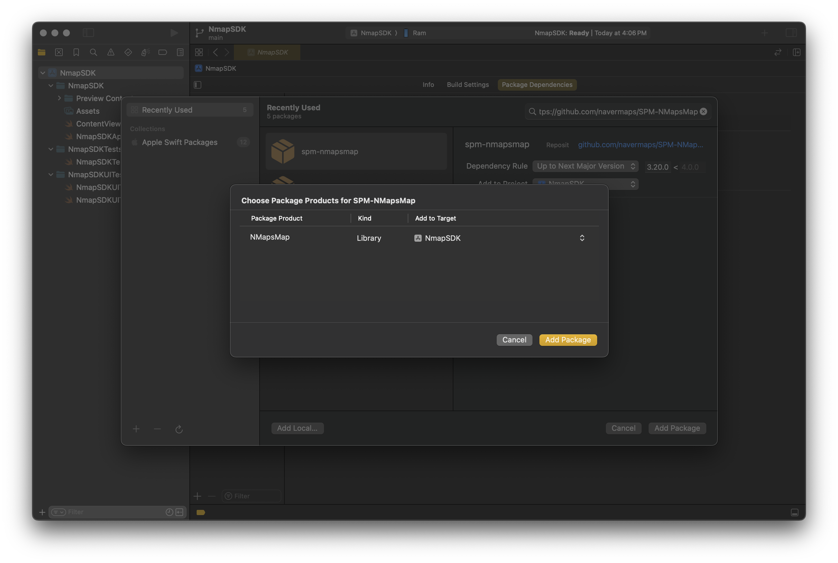 ์์กด์ฑ ์ถ๊ฐ๋ cocoapod์ ์ถ๊ฐํ๋ ๊ฒ๊ณผ package๋ก ์ถ๊ฐํ๋ ๋ฐฉ์์ด ์๋๋ฐ, 3.16.1 ์ดํ ๋ฒ์ ์ CocoaPods, ๊ทธ ์ด์ ๋ฒ์ ์ package๋ฅผ ์ถ๊ฐํ๋ฉด ๋๋ค.