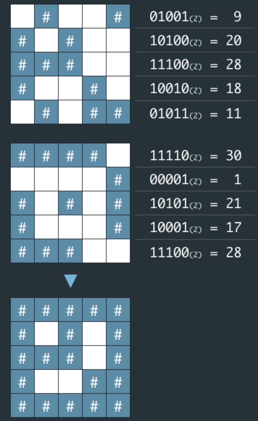 - ์ํธํ๋ ๋ฐฐ์ด์ ์ง๋์ ๊ฐ ๊ฐ๋ก์ค์์ ๋ฒฝ ๋ถ๋ถ์ 1, ๊ณต๋ฐฑ ๋ถ๋ถ์ 0์ผ๋ก ๋ถํธํํ์ ๋ ์ป์ด์ง๋ ์ด์ง์์ ํด๋นํ๋ ๊ฐ์ ๋ฐฐ์ด์ด๋ค.