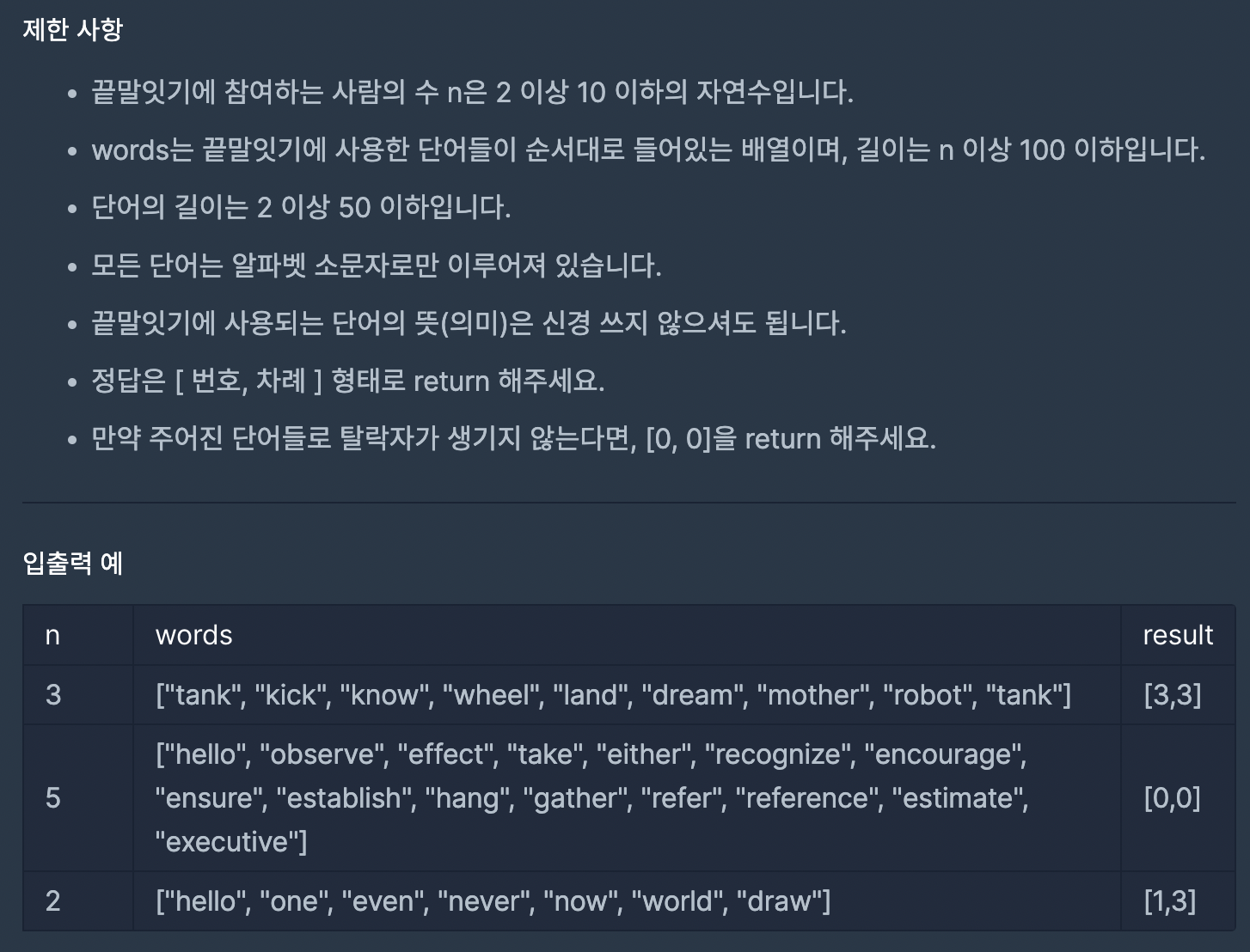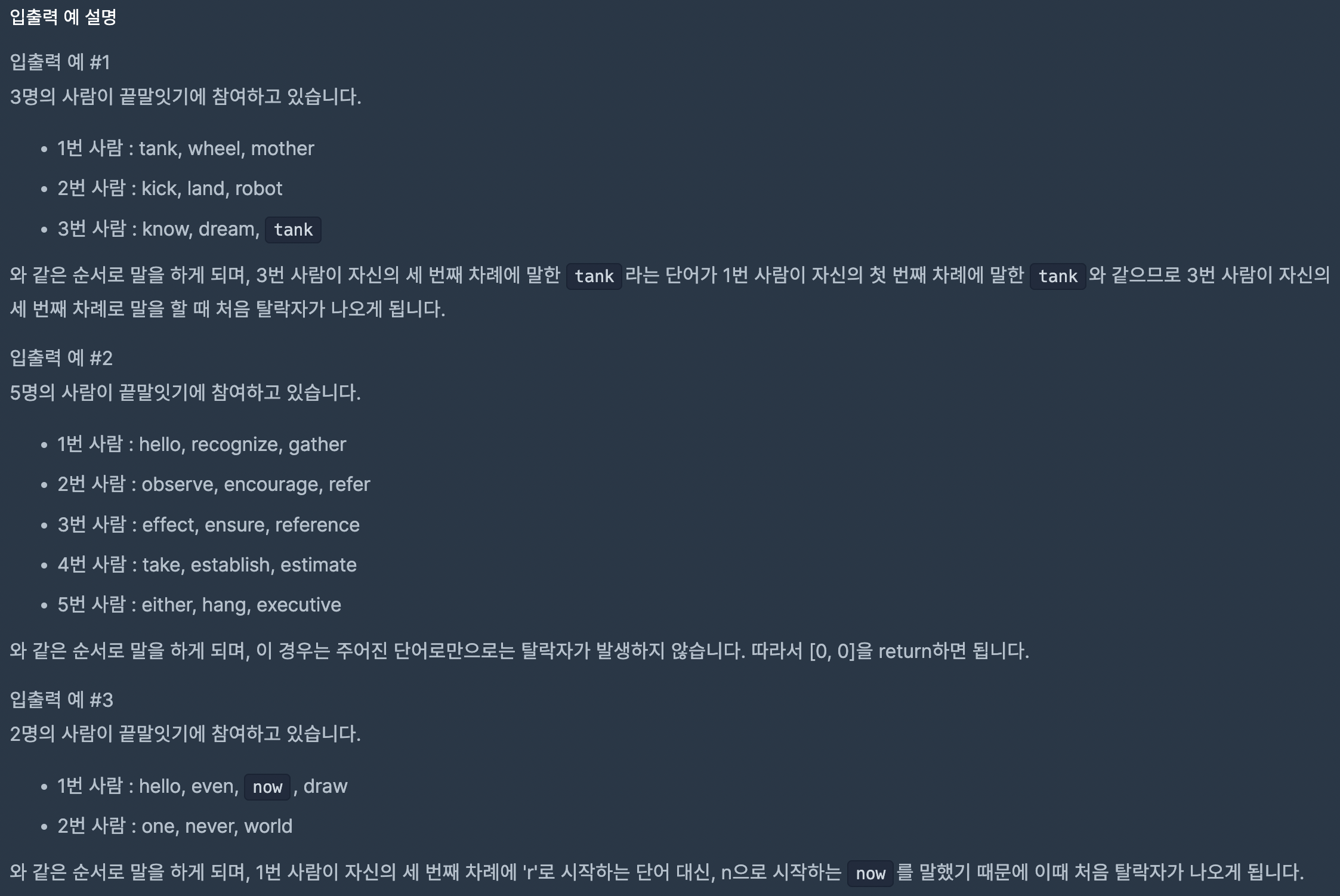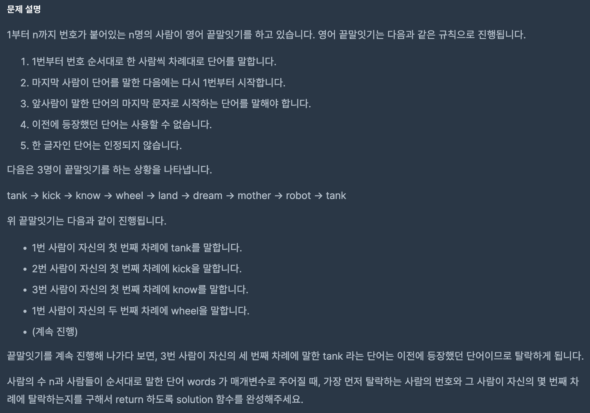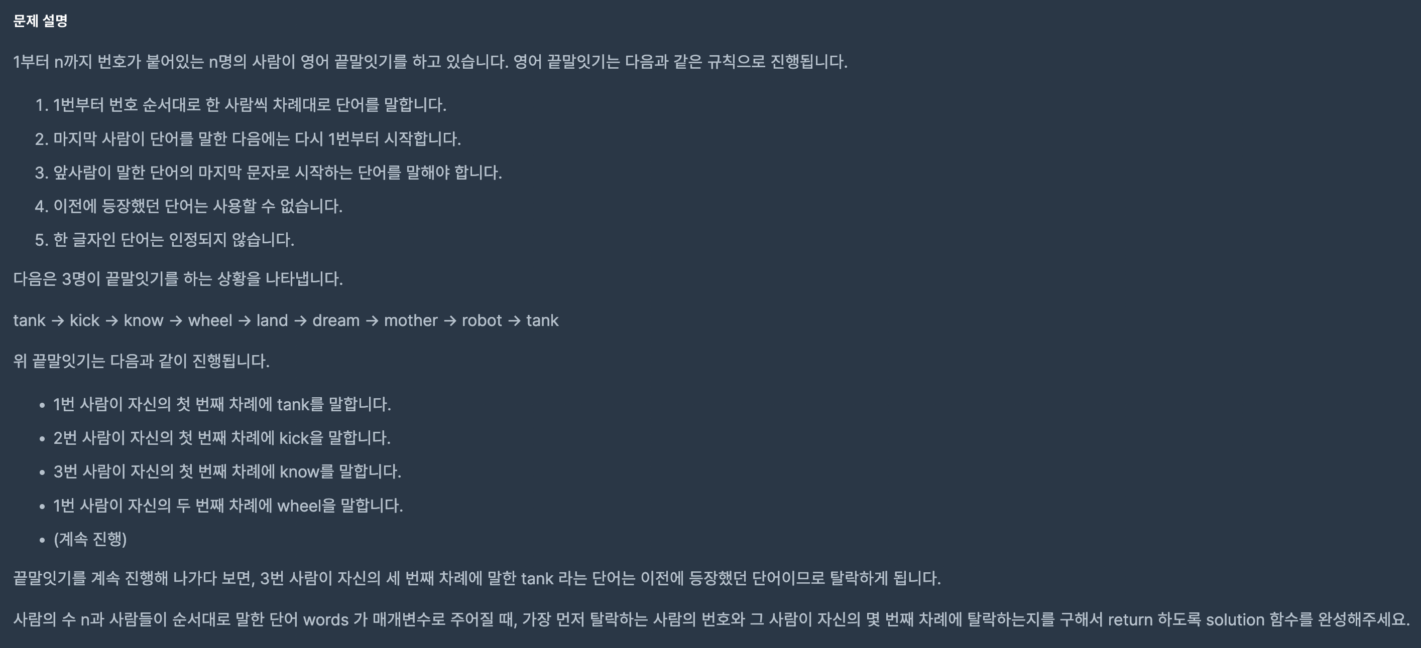 ์ด ๋ฌธ์ ๋ n๋ช ์ ์ฌ๋๋ค์ด ๋๋ง์๊ธฐ ๊ฒ์์ ํ ๋, (1)์๋ชป๋ ๋จ์ด๋ฅผ ๋งํ๊ฑฐ๋, ์ด์ ์ ๋งํ (2)์ค๋ณต๋ ๋จ์ด๋ฅผ ๋งํ๋ ๊ฒฝ์ฐ ์ข ๋ฃ๋๋ค.